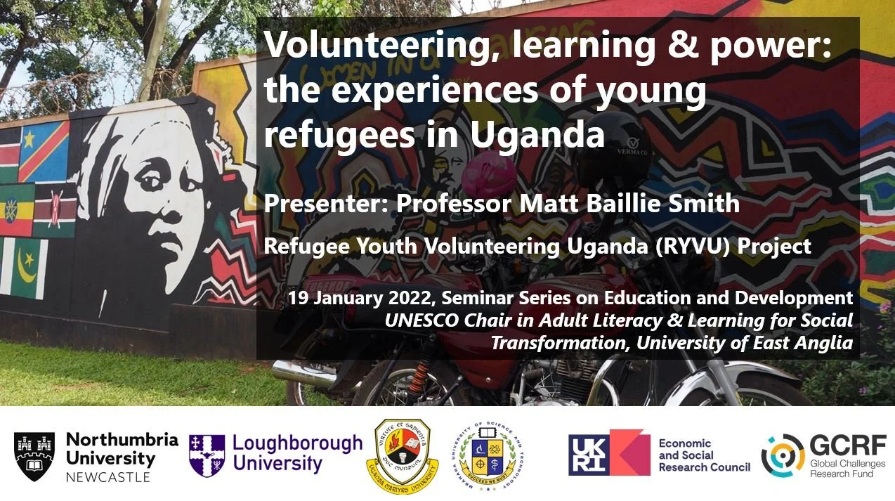 Professor Matt Baillie Smith’s talk was on the theme ‘Volunteering, learning & power: the experiences of young refugees in Uganda’. In this activity, he explored what volunteering means for refugee youth in Uganda, how learning happens (or not) in their experiences, and the forms of learning that emerge through and against their volunteer work.